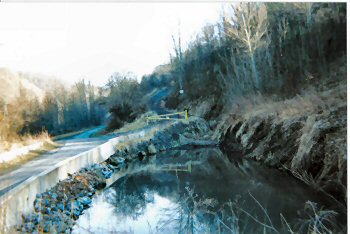 The only evidence of the Turkey Gap mine I found in 2004 was this settling pond at the toe of the reclaimed impoundment, the gate and haul road, and foundations of various vintages. (Mar. 2004 image by author)