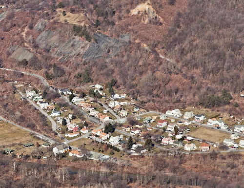 Aerial view of Ehrenfeld, Pennsylvania - Part of the huge slate dump at top of photo, part of the patch town on the right,