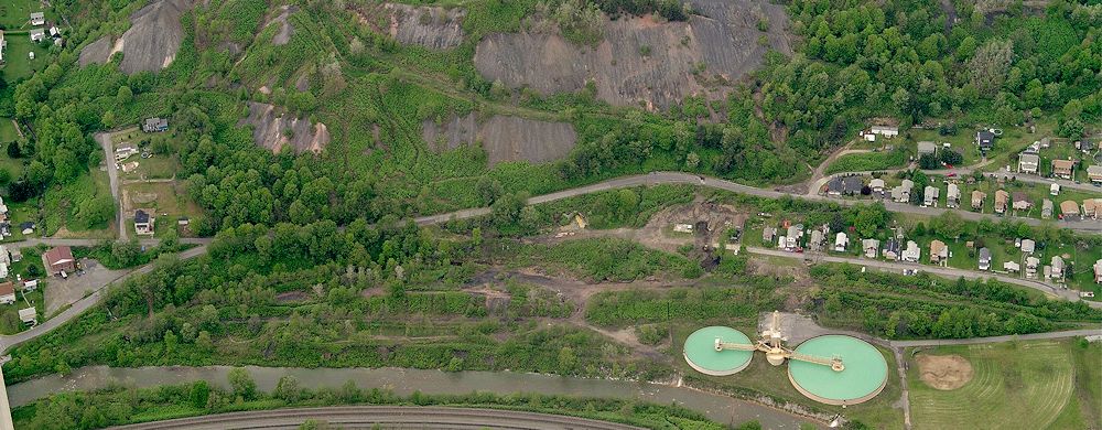 site of former coal mine and prep plant in center, acid mine drainage treatment at lower right, and the Littel Conemaugh River and Pennsylvania Railroad mainline at the bottom of the image. In the name of blooming