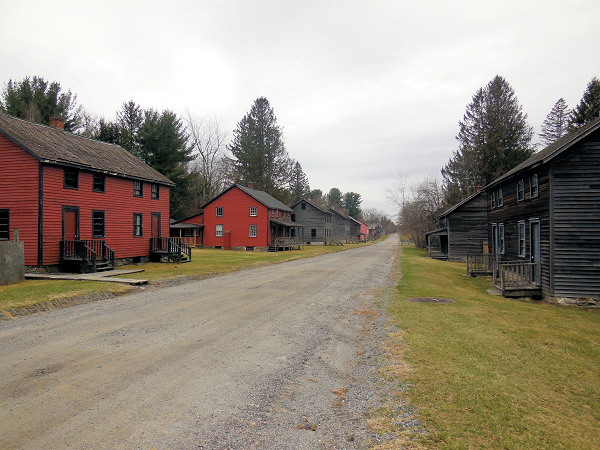 Duplex company houses lining both sides of Eckley's main street. This style of two-family house is known as the Pennsylvania Miners' House, and is synonymous