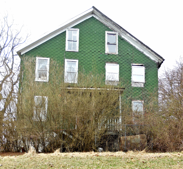 A coal company house at Maple Hill, Pa. still wearing the green asbesos siding that was apparently once very common in anthracite patch towns. At least one of the windows appears to be the original 4 pane design. The porch is authentic, too, as is part of the soffit.