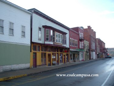 In this picture the company store is on the left, in the center background are a few company houses, and to the right is the Davis Coal & Coke administrative and engineering building.