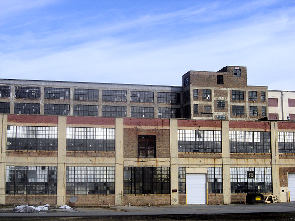 This ex-Studebaker assembly building is typical of early 20th century manufacturing architecture: Multi-level masonry construction with hundreds of glass pane windows. 21st century