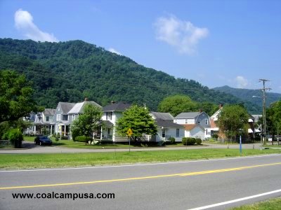 The company town of Falls View, WV, built in 1930-31 for the employees of the EMCO ferroalloy plant. U.S. Route 60 is in the foreground.