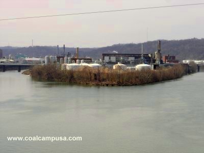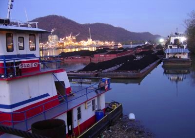 The most common freight on the Kanawha River by far is coal. The Amherst coal dock is on the left side of this photo. Other coal docks on the Kanawha include the
