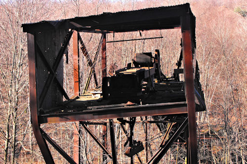 Although all of the chutework and loading booms have been removed, a vibrating screen is still mounted inside the dilapidated Chest Creek tipple. And I don't