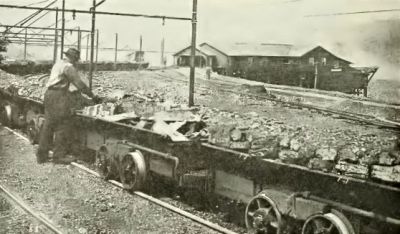 Ancient photo of loaded mine cars waiting to be dumped into the