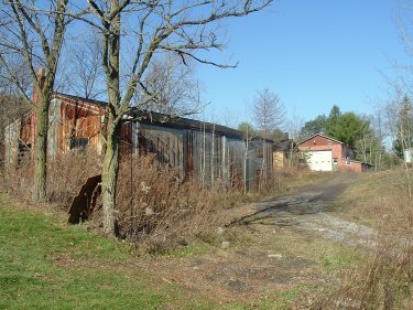 These buildings and a remnant of the gob pile were the only remnant of the Elbon mine that I saw. (Nov. 2005 image by author)