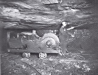 Ancient photo of a coal miner using Ingersoll-Rand equipment in the Lynch coal mine.