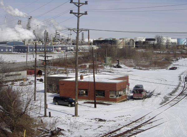 Wheeling and Lake Erie Railway's yard office in front of Marathon Oil's refinery in Canton.