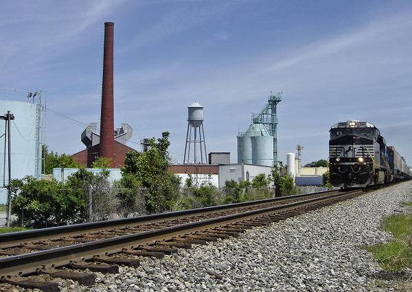 Norfolk-Southern train passes General Electric's Bucyrus Lamp Plant.