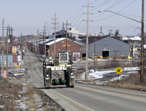 These specialized vehicles carry steel back and forth between Canton mainstay Timken's storage yard and factory, shown in the background. United Steelworkers Local 1123 represents the workers at the Timken plant.
