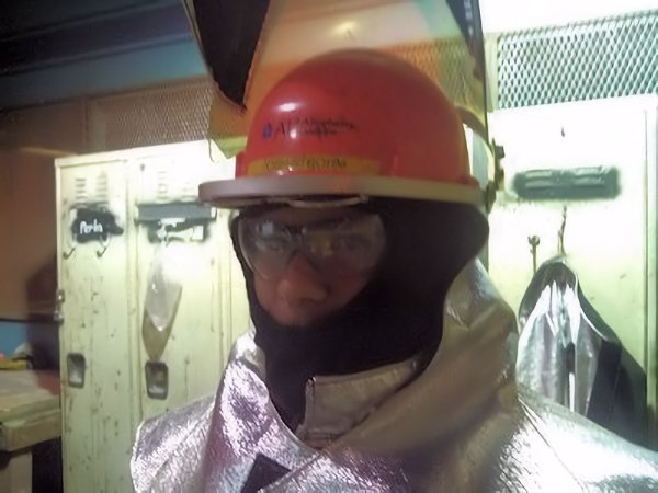 Allegheny Ludlum steel worker wearing his "hot metal suit" to protect him from the intense heat
