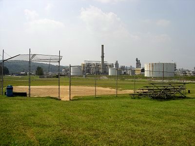 Ballfield next to the sprawling complex of Bayer in Institute, WV. One of several chemical plants in the Kanawha Valley, this one manufactures polyurethane.