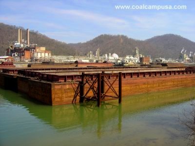 Barges full of coal in front of Kanawha River Terminal's Marmet Dock, with the Dupont Belle plant across the river in the background.