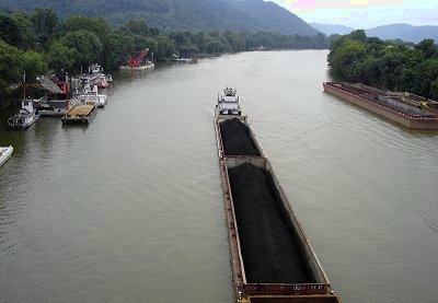 The most common freight on the Kanawha River by far is coal. The Amherst coal dock is on the left side of this photo. Other coal docks on the Kanawha include the
