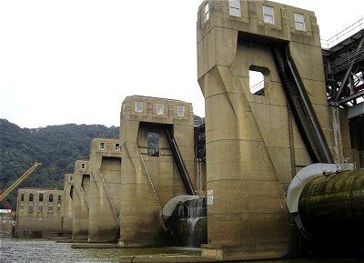 There are three locks on the river - Winfield, London, and, pictured here, Marmet. The Marmet Lock/Dam was built in 1934-35 and generates electricity through the three