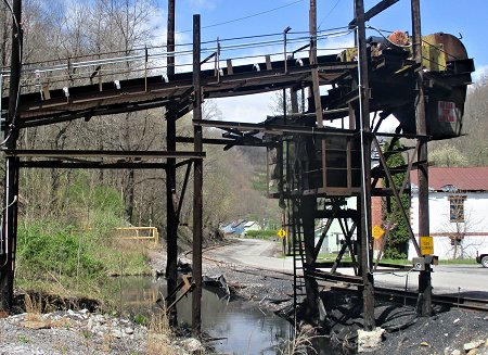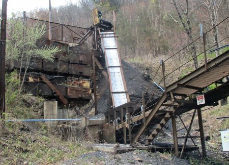 This mine loads coal the old fashioned way, with a man standing on and between the two cars operating the hand brake. He then rolls the car down the
