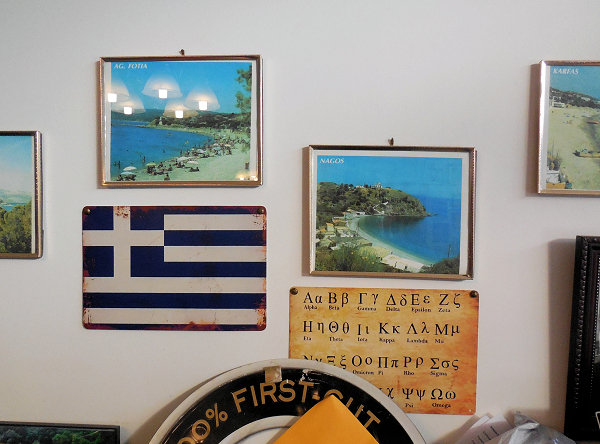 Paraphernalia related to Greek heritage on an interior wall of Ya'sou Deli.