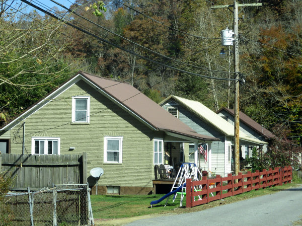 Former company houses that have been updated with various siding, roofing, and foundation materials. The chimneys have been removed from them as well.