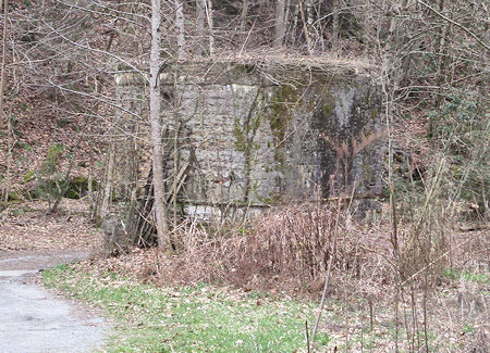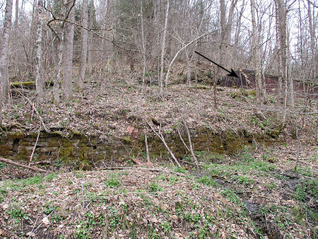 Stone wharf wall remaining from the Indian Ridge coke ovens. Arrow points to an old Norfolk & Western
