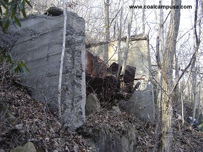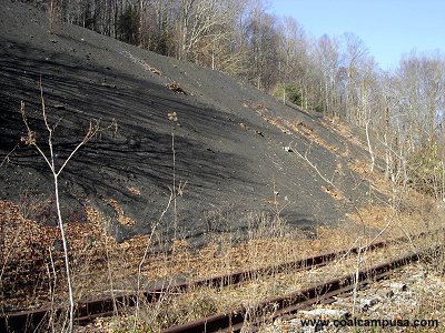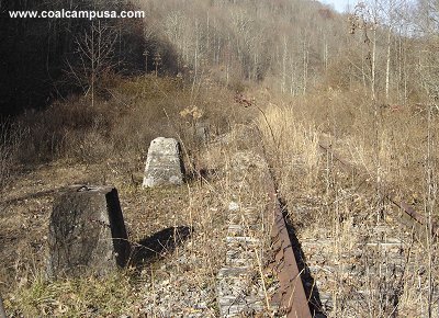 Tipple foundations and the former Virginian Railway branch that ran up to the mines at Whitby, Jonben, and Fireco. These rusty, overgrown rails haven't seen a train in years.