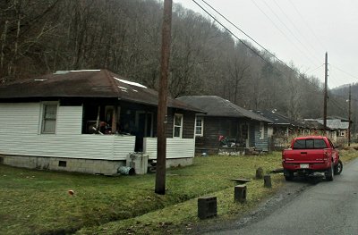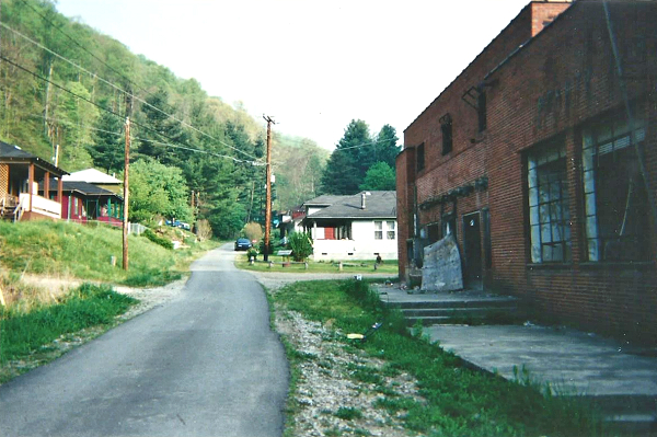 chatting in the shade of the abandoned company store and office building. Behind them the screen doors hung lopsided from one hinge. Most of the houses are deserted and the windows gape jaggedly where they were smashed. Weeds and
