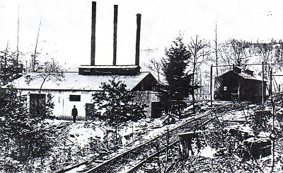 a community named "Blue Jay Mine No. 7" in that vicinity. The location of Blue Jay Mines Nos. 1 through 5 are unknown, but their tonnage has been recorded. The photo shown here is of the power house and motor barn at one of the Blue Jay Lumber Company coal mines, and appeared in the small magazine "The Log Train" in the 1980s. The article in the magazine showed other pictures from the Blue Jay mines, but did not identify at which mines the photographs were taken. Evidently information