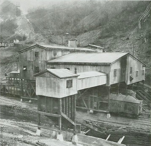 The old "No. 9" tipple at Helen, with an aerial tramway hauling refuse up the hill. The tram has spilled a lot of slate over the years, and