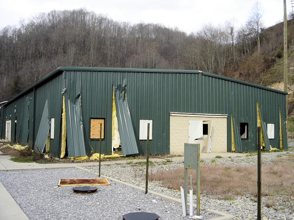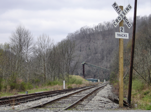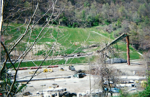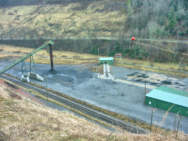This photograph taken in April 2001 shows White Mountain Mining's Stotesbury operation just before it opened. Three new orange scoops, as well as another piece of underground equipment painted white, are visable. This was just after the California brownouts of 2000-2001 had driven the price of coal up and everyone in coal country was optimistic. I even heard reports of steam coal selling