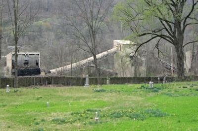 Cemetery behind a coal truck dump to coal barger loader in Coalburg, W.Va.