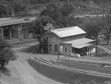 The Campbells Creek Coal Company store at Dana, WV still existed when this picture was snapped from the Turnpike bridge over the river in 1991, but has since been demolished. US