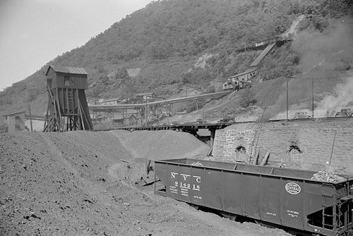 a conveyor crossing over Route 60 and going up to the head house. In the background are company houses. This coal mine and coke works