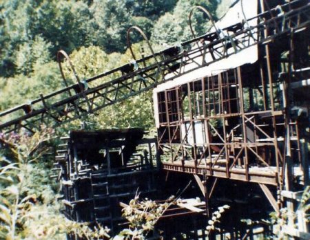 The tipple from the Catherine mine near Muddelty, Nicholas County, was one of the last wooden tipples remaining in West Virginia. The raw coal feed conveyor has been removed from the tipple. For more information
