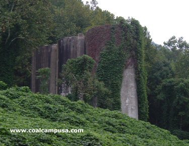 These silos, and part of the aerial tram and barge loader, are all that remains of Semet Solvay's once large mine at Harewood, WV.