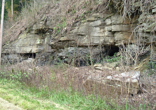 Coal outcrop and mine "rooms" at Ward, W.Va. Ward and Mammoth were two coal company towns on Kellys Creek, which empties into the Kanahwa River at Cedar Grove, namesake