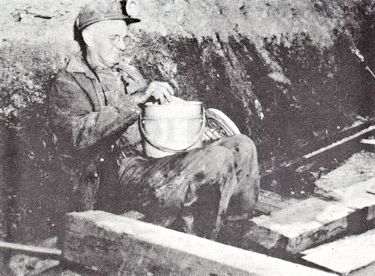 A coal miner with his dinner bucket sitting down to lunch in the "dinner hole" in one of the Milburn Colliery Company's mines.