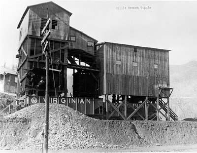 Scene from many years ago showing the coal tipple at Willis Branch, WV. There was