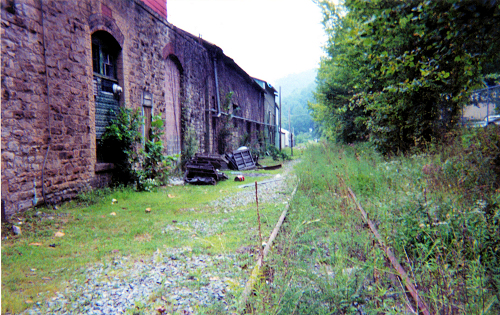 Walking down the abandoned railroad behind coal company buildings (powerhouse?).
