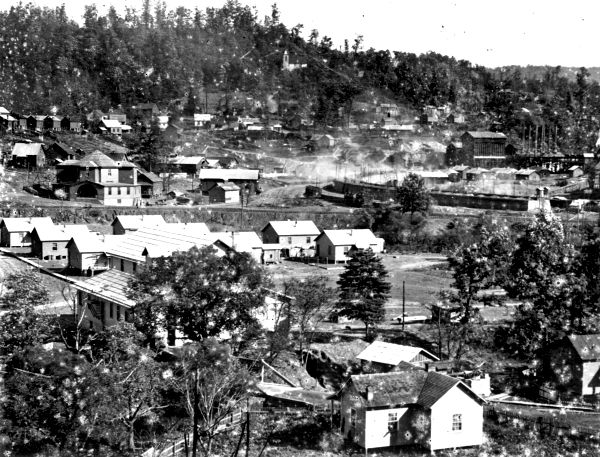 In the foreground are coal camp houses and a company store that were probably owned by McKell Coal & Coke. The railroad running across the middle