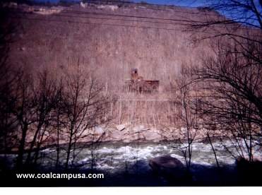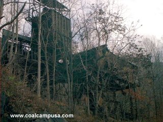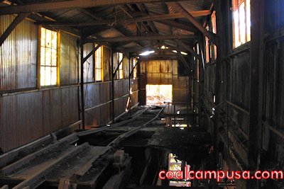 View of the tipple from the railroad. The taller portion of the tipple was a bin to store any excess coal production until it could be shipped.