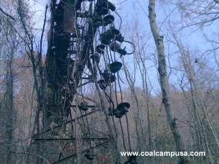 Buttons dangling from the button line, which predates the conveyor belt. It comes out of the back of the tipple and runs up the mountain to the headhouse.