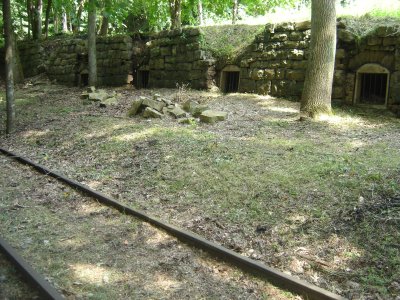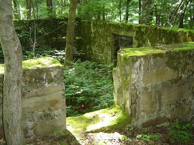 Ruins of the sand house. Sand was deposited on rail tracks to help the mine motors gain traction. This is still practiced with modern railroads.
