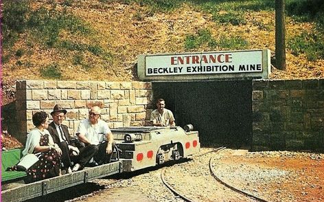 can be found the Beckley Exhibtion Coal Mine. This tourist trap was opened in 1962, and has been a popular attraction ever since. It is shown here when it was new. Visitors ride on a mantrip into the mine and are taught various historical and geological facts about WV coal mining. When I was