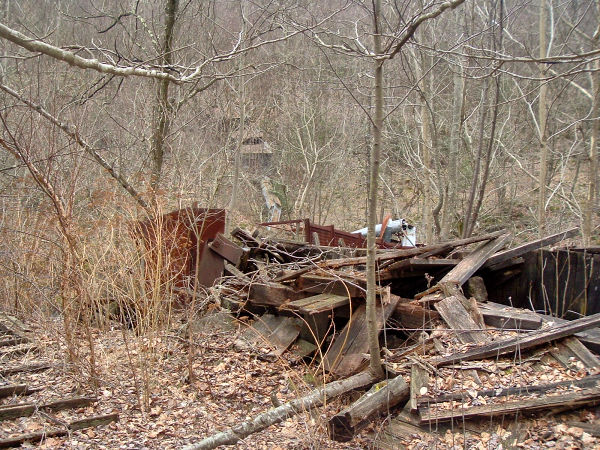 only moss-covered ties remain. This wooden tipple, shown here, is now a collapsed heap of boards. A conveyor coming to the tipple spanned Piney Creek, and came from a headhouse on the other side of the stream, visable in the