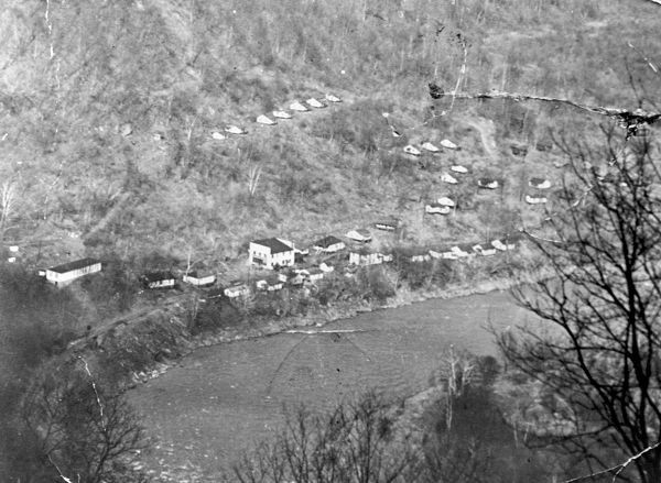 mountain on the Fayette County side of the river. This photo shows the company store in the middle of the camp, as well as the mighty