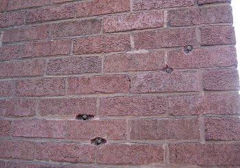 These brass plugs in the side of a store in downtown Matewan fill in bullet holes left from the "Battle of Matewan."