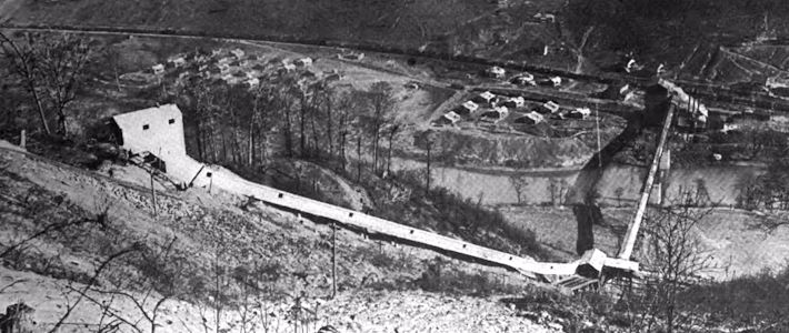 1914 photo showing the coal camp of Borderland, WV in the background, the Tug Fork in the center, and the conveyor crossing the river and going up the mountain to the coal mine headhouse. The coal was mined on the Kentucky side of the Tug Fork, where this photo was taken, and cleaned and loaded onto the train on the West