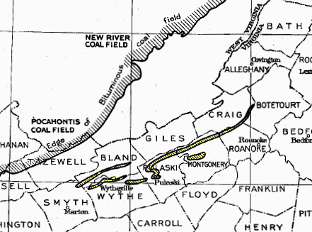 Pulaski Counties, but, geologically speaking, the field extneds into Wythe, Bland, Roanoke, and Craig Counties. Some of the coal mines actually went under the New River. The success of this coalfield