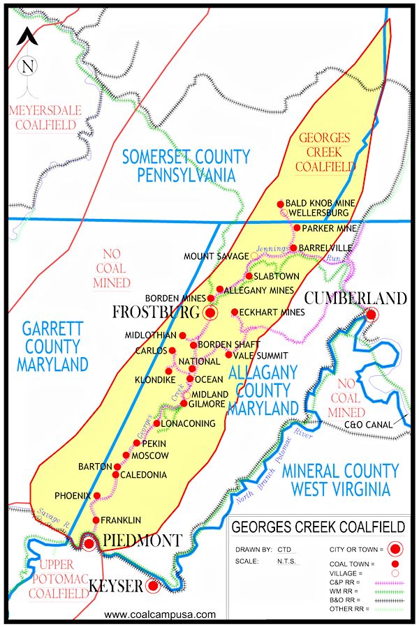 Most of this coalfield lies in Allegany County, but it does extend into Garrett County. However, all of the historic mining towns